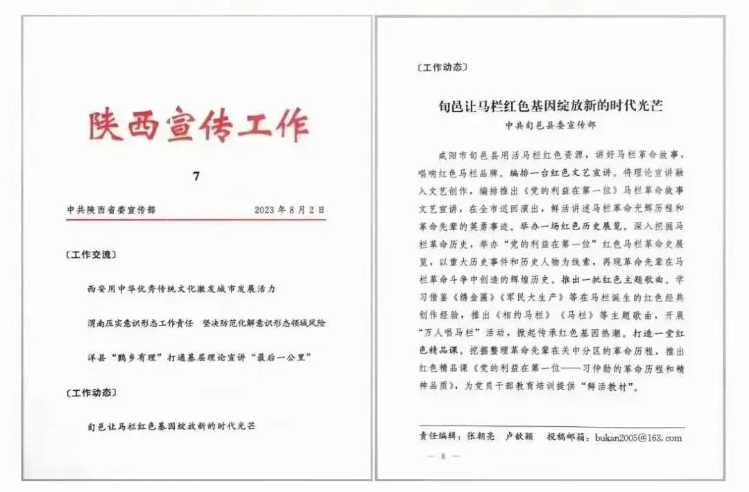 旬邑县充分依托本地深厚红色积淀,积极开辟红色文化传播新途径,学习借鉴《绣金匾》《军民大生产》等在马栏诞生的红色经典创作经验,有机整合《红色马栏》《马栏颂》《马栏的故事》等本地原创歌曲,进行重新编排和创作,相继推出了红色主题歌曲《相约马栏》《马栏》。歌曲以马栏革命历史为背景,深情歌颂了红色马栏的光辉革命历程和革命先辈的崇高精神品质。两首歌曲分别邀请著名歌唱家刘子旗、王宏伟演唱,气势磅礴、振奋人心,具有极高的传唱度和感染力;同步制作了歌曲MV,并在“学习强国”学习平台及各级各类媒体、视频网站进行推送。同时,在全县各级各部门、企事业单位和中小学校广泛开展讲述红色故事、传唱红色经典等主题教育活动,充分发挥了红色文化凝心铸魂、资政育人的作用。